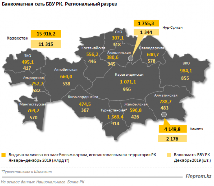 Среди регионов РК наибольший объем выдачи наличных за 2019 год приходится на Алматы (4,1 триллиона тенге) и Нур-Султан (1,8 триллиона тенге). Также более триллиона тенге наличных было выдано в Туркестанской области, Шымкенте (1,6 триллиона тенге) и Карагандинской области (1,1 триллиона тенге).