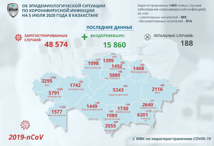 По состоянию на 5 июля 2020 года в Казахстане зарегистрированы 1403 новых случая заболевания коронавирусной инфекцией, из них: