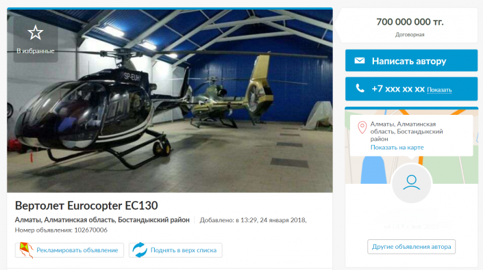 Три многофункциональных вертолета Eurocopter EC130 можно приобрести на сумму штрафа. Стоимость одного транспортного средства доходит до 700 миллионов тенге. Вертолет вмещает одного пилота и семь пассажиров, он предназначен для выполнения различных задач: от патрулирования до воздушного туризма и VIP-перевозок.