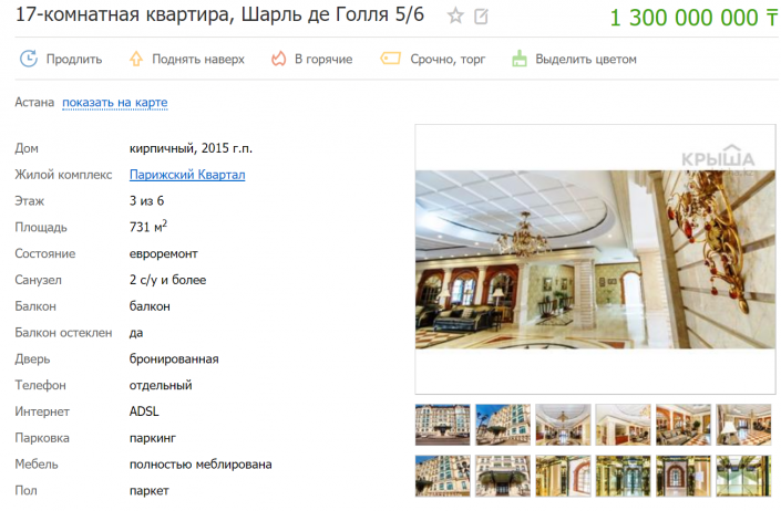 За два миллиарда можно купить самую дорогую в Астане 17-комнатную квартиру, площадью 731 квадратный метр. Еще останутся 700 миллионов тенге.