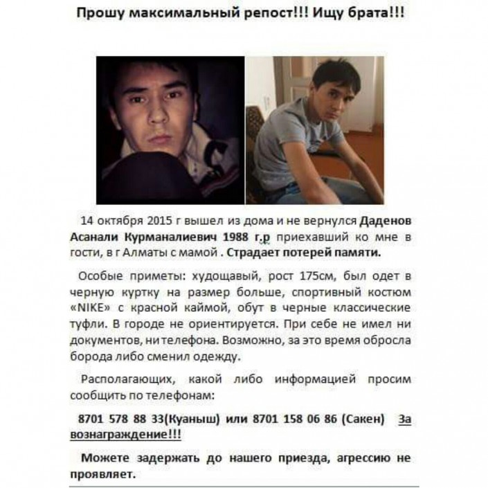 Как рассказал брат без вести пропавшего Асанали Даденова, они готовы заплатить за любую информацию, которая поможет его найти. "Вначале мы хотели наградить людей, которые помогут нам, в размере 50-100 тысяч тенге. Однако с октября нет никакого продвижения в этом деле. Поэтому мы из личных сбережений собрали 2000 долларов, чтобы как можно больше людей подключились к поиску брата", - поделился Сакен Даденов.