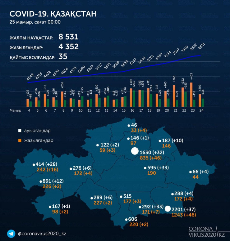 За сутки в Казахстане коронавирусом заразились 209 человек, передает Tengrinews.kz со ссылкой на Сoronavirus2020.kz.
