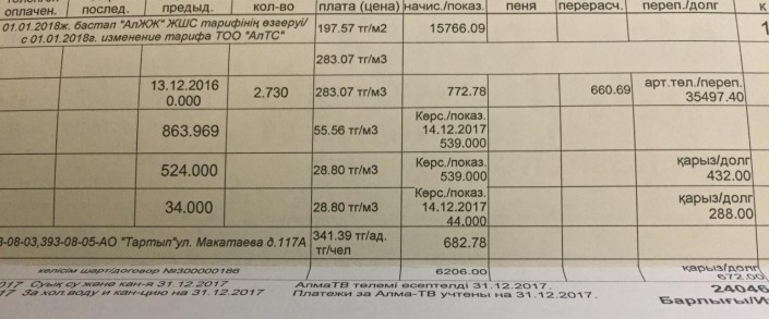 В свою очередь, жительница города Куралай Скакова, в доме которой установлен счетчик, сообщила, что в ноябре 2017 года тариф за отопление для нее составлял 35 тенге за квадратный метр, а уже в декабре он вырос до 197,57 тенге.