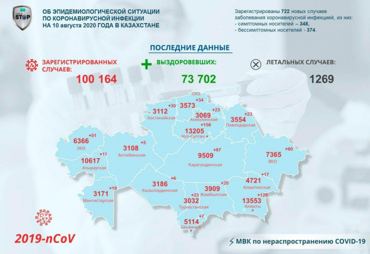 Напомним, за прошедшие сутки (10 августа) в Казахстане выявлено 722 заболевших коронавирусом. Общее число инфицированных превысило 100 тысяч.