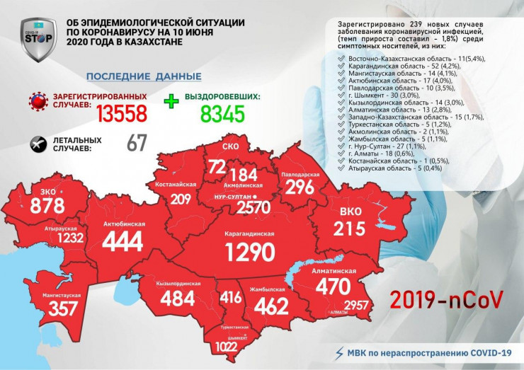 За прошедшие сутки (10 июня) в Казахстане выявлено 239 заболевших коронавирусной инфекцией, передает Tengrinews.kz.