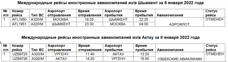 "Из/в города Алматы, Актау, Туркестан, Шымкент, Костанай иностранными авиакомпаниями отменено выполнение 21 рейса в/из городов Москва, Франкфурт, Баку, Дубай, Шарджа, Минск, Стамбул, Ургенч", - также говорится в сообщении МИИР.