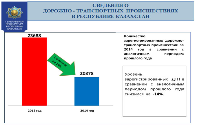 Между тем по сравнению с 2013 годом количество происшествий снизилось на 14 процентов, число погибших в них граждан уменьшилось на 15 процентов, что свидетельствует о результатах планомерной профилактической работы в сфере безопасности дорожного движения. Ранее сообщалось, что Казахстан вошел в список стран, где наиболее часто случаются смертельные аварии. Более детальную информацию о совершенных ДТП в Казахстане можно узнать по карте аварийности: