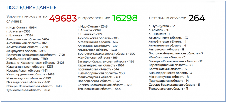 Всего в стране, по данным МВК, 49 683 случая заражения. 16 298 из них выздоровели. Таким образом, около 33 тысяч человек являются активно зараженными в Казахстане.