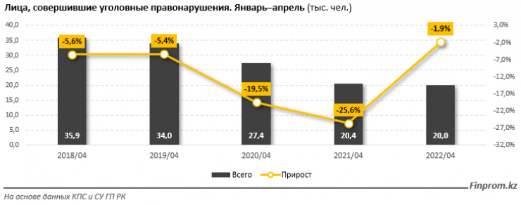 Чаще всего за январь – апрель 2022 года в Казахстане преступники совершали правонарушения против собственности: 63,1 процента от общей численности, или 12,6 тысячи человек, - на 3,2 процента меньше, чем годом ранее. В этом сегменте чаще всего попадались на кражах, мошенничестве, мелких хищениях, грабежах, присвоении или растрате вверенного чужого имущества, неправомерном завладении автомобилем или иным транспортным средством без цели хищения.