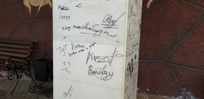 Белый дорогой гранит изрисован вандалами.
