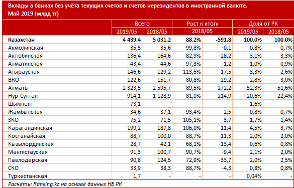 Самое заметное сокращение вкладов в иностранной валюте зафиксировано в Восточно-Казахстанской (на 19,2 процента), Павлодарской (на 27,1 процента) и Кызылординской (на 31,9 процента) областях.