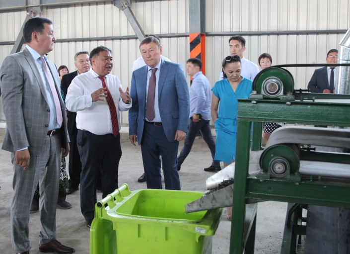 Технический директор Q-Recycling Айдын Нурахметов рассказывает о предприятии заместителю акима Алматинской области Айдарбеку Байжанову