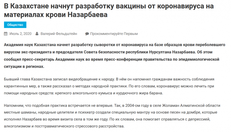 Бұл мәлімет "Панорама" атты ресейлік сатиралық сайтта пайда болды. Онда бұл вакцинаны Қазақстан Ғылым Академиясы әзірлеп жатқаны айтылады.