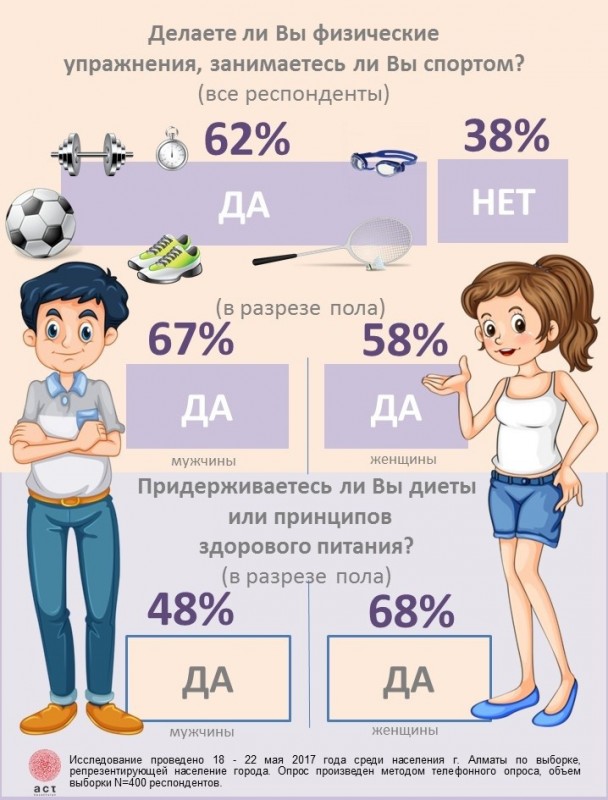 Исследовательская компания "АСТ Казахстан" провела опрос и выяснила, как алматинцы относятся к спорту и правильному питанию, передает корреспондент Tengrinews.kz