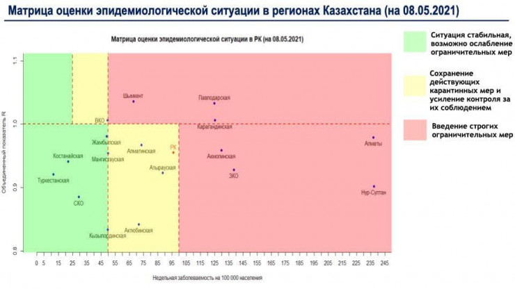 В "красной" по-прежнему находятся Нур-Султан, Алматы, Шымкент, Акмолинская, Западно-Казахстанская, Карагандинская, Павлодарская области.