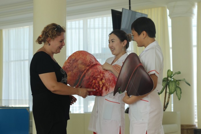 "Добрый день, я здоровая печень.  Давайте знакомиться!" - этот разговор реален. Печень - всего лишь образ, в котором сегодня выступает медсестра Мульдира: она, Мульдира, напоминает прохожим о  том, как важно заботиться о ней, единственной у каждого из нас печени. От здоровья до болезни – всего лишь один шаг: рядом со здоровой печенью шагает больная цирозная - еще один живописный образ, который лучше любых слов говорит посетителям, чем могут закончиться вредные  привычки и запоздалые  обращения к врачам.