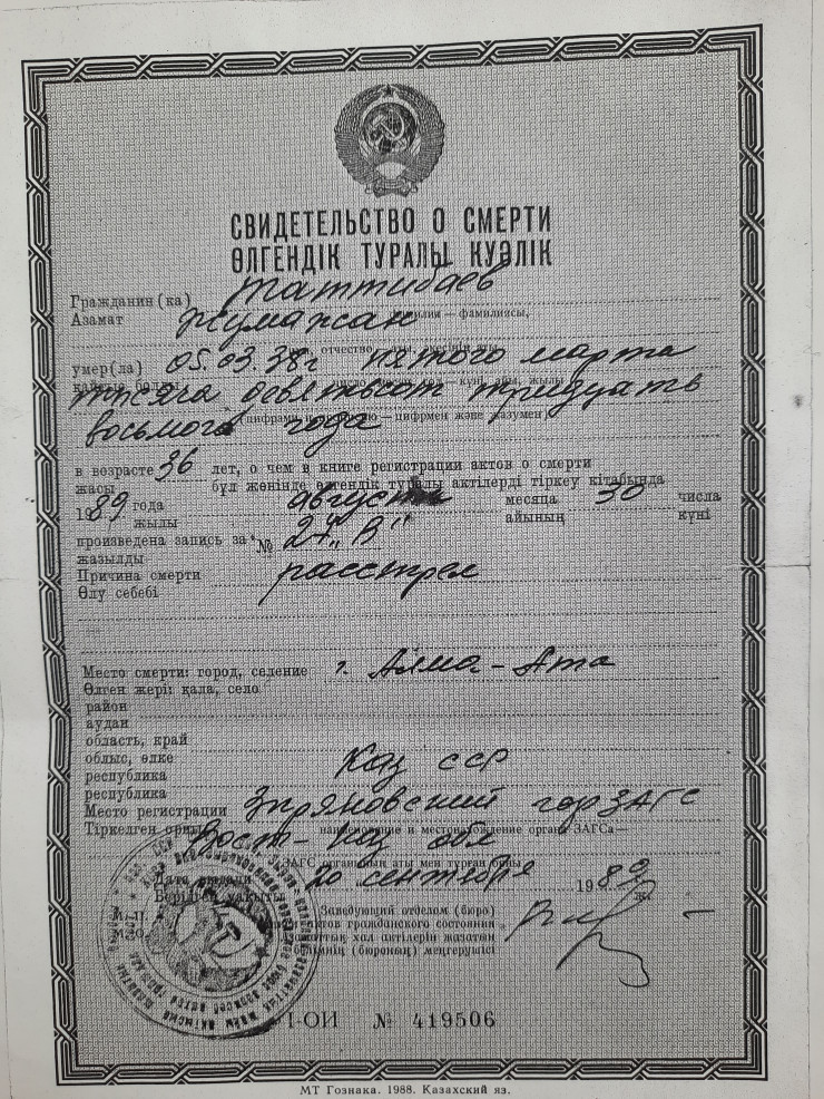 Ал, әкемнің атылғанын ешкім білген жоқ, анамның қолында әкемнің 1943 жылы майданда қайтыс болғаны туралы құжат қана болды. Кейін мұрағаттың бәрі ашылғанда әкемнің атылғанын білдік.