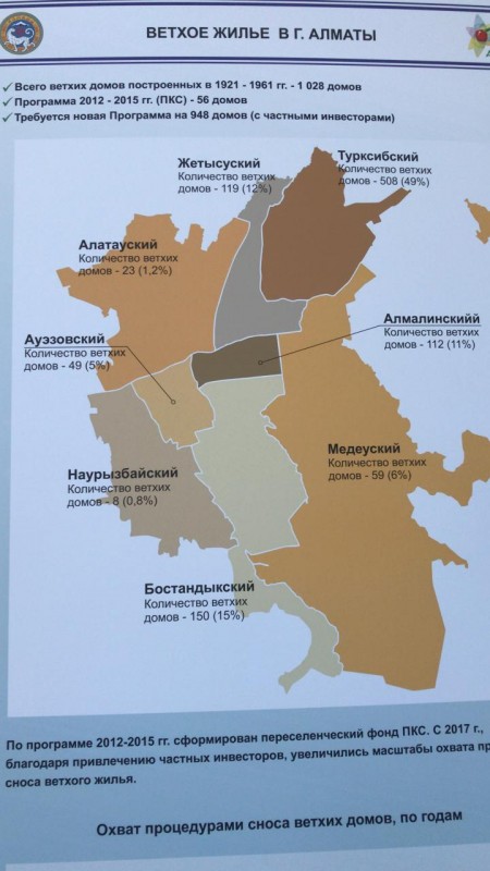 Всего в Алматы ветхих домов, построенных в 1921-1961 годах, 1028. В Турксибском их 508, что составляет 49 процентов построек. В Бостандыкском районе 150 домов признаны ветхими, а это 15 процентов строений. В Жетысуском 12 процентов, то есть 119 жилищ. В Медеуском районе 6 процентов домов - 59. В Ауэзовском - 49 (5 процентов), в Алатауском 23 дома (1,2 процента). В Наурызбайском районе всего восемь ветхих построек - то есть 0,8 процента.