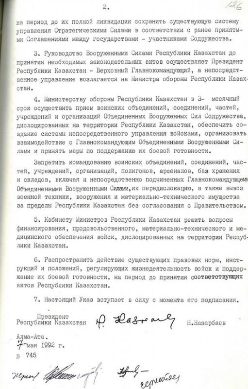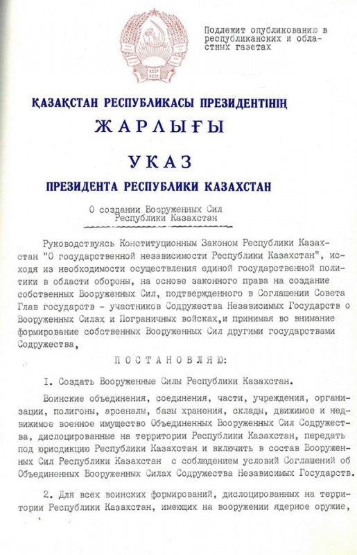 "В этих условиях было решено все подразделения, находившиеся на территории республики и оставшиеся от Среднеазиатского и Туркестанского военных округов и 40-й Армии, вышедшей из войны в Афганистане, объявить частями Вооруженных Сил Казахстана. Такой Указ мной был подписан 7 мая 1992 года", - говорится в публикации.