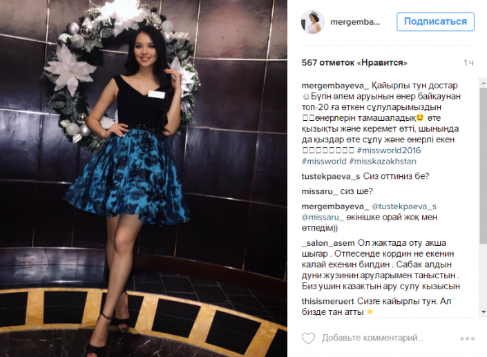 Своим подписчикам Алия сообщила о том, как проходили этапы конкурса "Мисс Мира". Казахстанка отметила, что ей понравилось проходившее действие. На вопрос поклонников, прошла ли она этап конкурса, Алия ответила, что нет. "К сожалению, я не прошла", - написала Алия Мергембаева в комментариях.