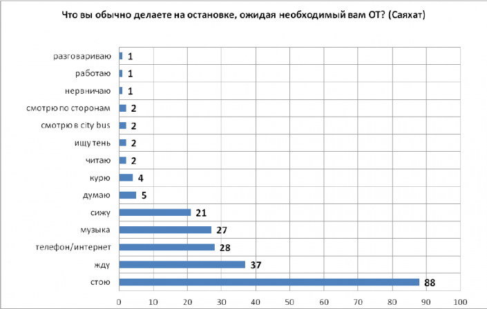 Исследователи установили, что 60 процентов пассажиров ожидали транспорт от 1 до 5 минут, остальные 40 процентов - от 5 до 15 минут. После 7-10 минут ожидания некоторые люди ловят такси. На "Саяхате" за 40 минут такси ловят 59 человек, из них 46 - на второй полосе движения.