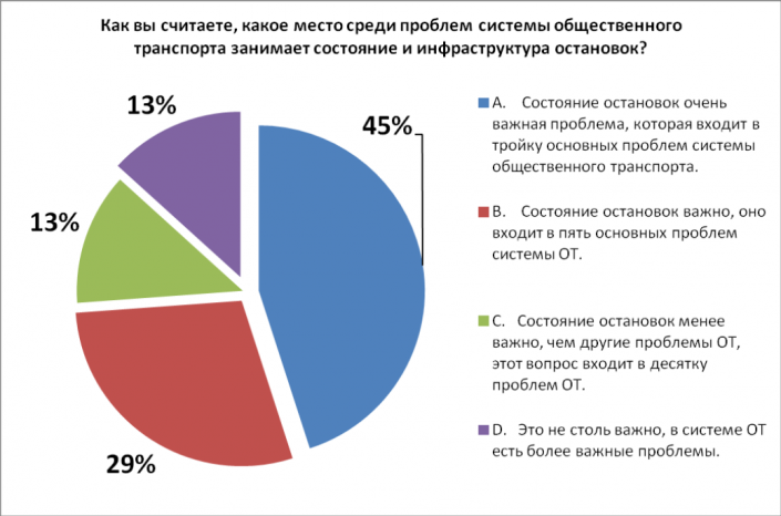 Опрос 604 респондентов показал, что большинство (45 процентов) считает состояние остановок очень важной проблемой, которая входит в тройку основных проблем общественного транспорта.
