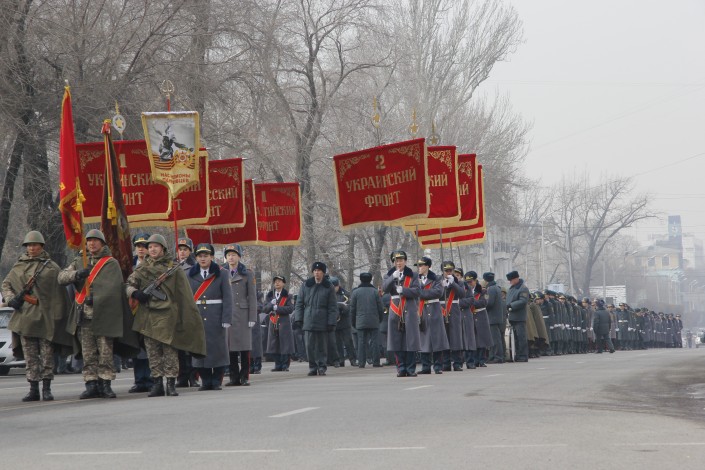 В торжественном параде граждан приняли участие свыше 500 военнослужащих и жителей города. Шествие стартовало от памятника Динмухамеда Кунаева и завершилась возле Вечного огня в парке имени 28 гвардейцев-панфиловцев. На протяжение 1100 метров торжественный марш сопровождал военный оркестр.