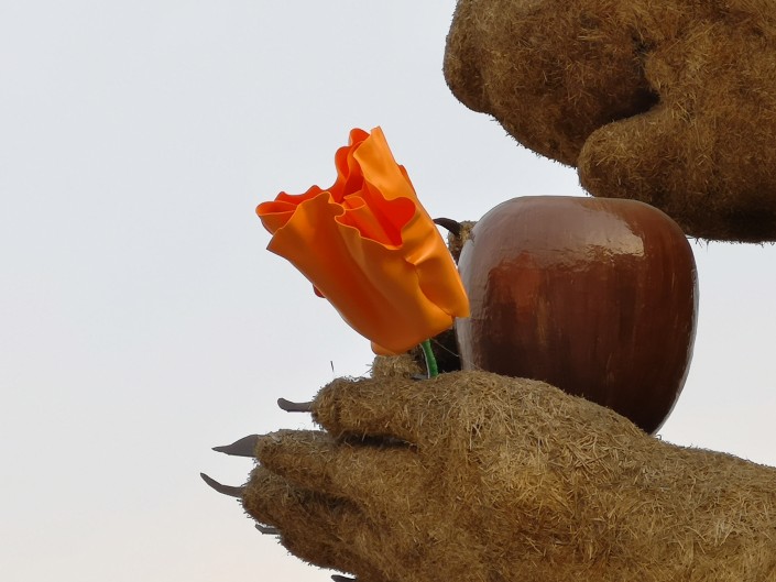 На голове животного теперь зеленая тюбетейка, а в лапах красуется пятиметровый тюльпан.