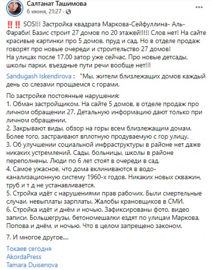 Речь идет о жилом комплексе, который возводится в квадрате улиц Маркова-Сейфуллина-Аль-Фараби-Попова. Экоактивист Салтанат Ташимова заявила на своей странице в Facebook о том, что застройщик нарушает не только правила застройки, но и обманывает горожан.