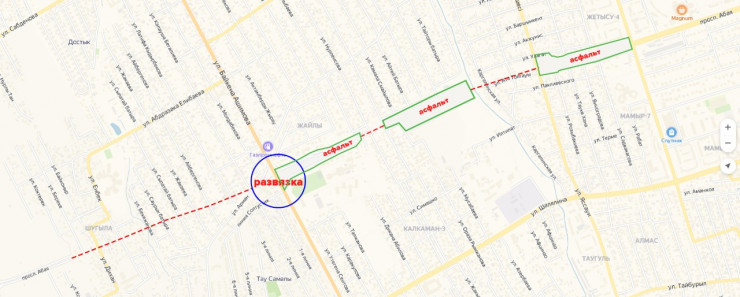 Сначала была построена дорога в районе административного центра Наурызбайского района. Далее строители проложили асфальт от улицы Яссауи до улицы Ашимова. Теперь они намерены соединить два участка одного проспекта с помощью эстакадного моста.