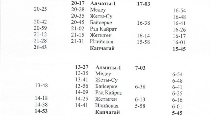 Поезд № 6955/6956/6957/6958 Алматы-1 – Капшагай будет производить посадку и высадку пассажиров по станциям: Алматы-1, Медеу (станция находится на железнодорожной линии Берлик 1 - Актогай, между станциями Алма-Ата 1 и Жеты-Су), Байсерке, разъезды Кайрат, Жетыген, Илийская, станция Капшагай, город Капшагай.