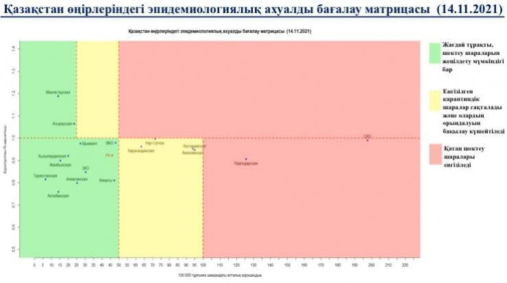 В "зеленой" зоне: Алматы, Шымкент, Актюбинская, Атырауская, Алматинская, Западно-Казахстанская, Туркестанская, Жамбылская, Кызылординская, Мангистауская, Восточно-Казахстанская области.