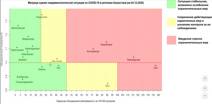 По данным портала, в "зеленой" зоне также находятся Мангистауская, Жамбылская, Туркестанская, Карагандинская, Алматинская, Актюбинская, Кызылординская, Западно-Казахстанская области и Шымкент.