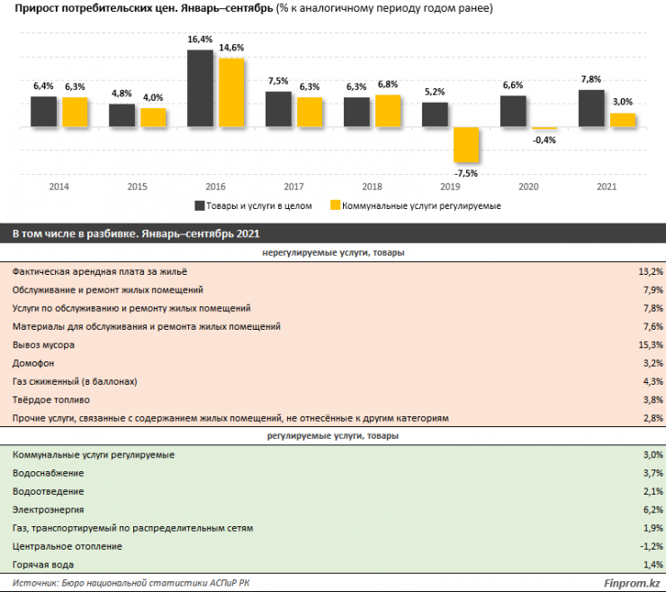 По данным анализа Finprom.kz, жилищные услуги, такие как вода, электроэнергия, газ, подорожали за девять месяцев текущего года относительно аналогичного периода прошлого года на 5,7 процента. При этом комуслуги, регулируемые государством, выросли на 3 процента.
