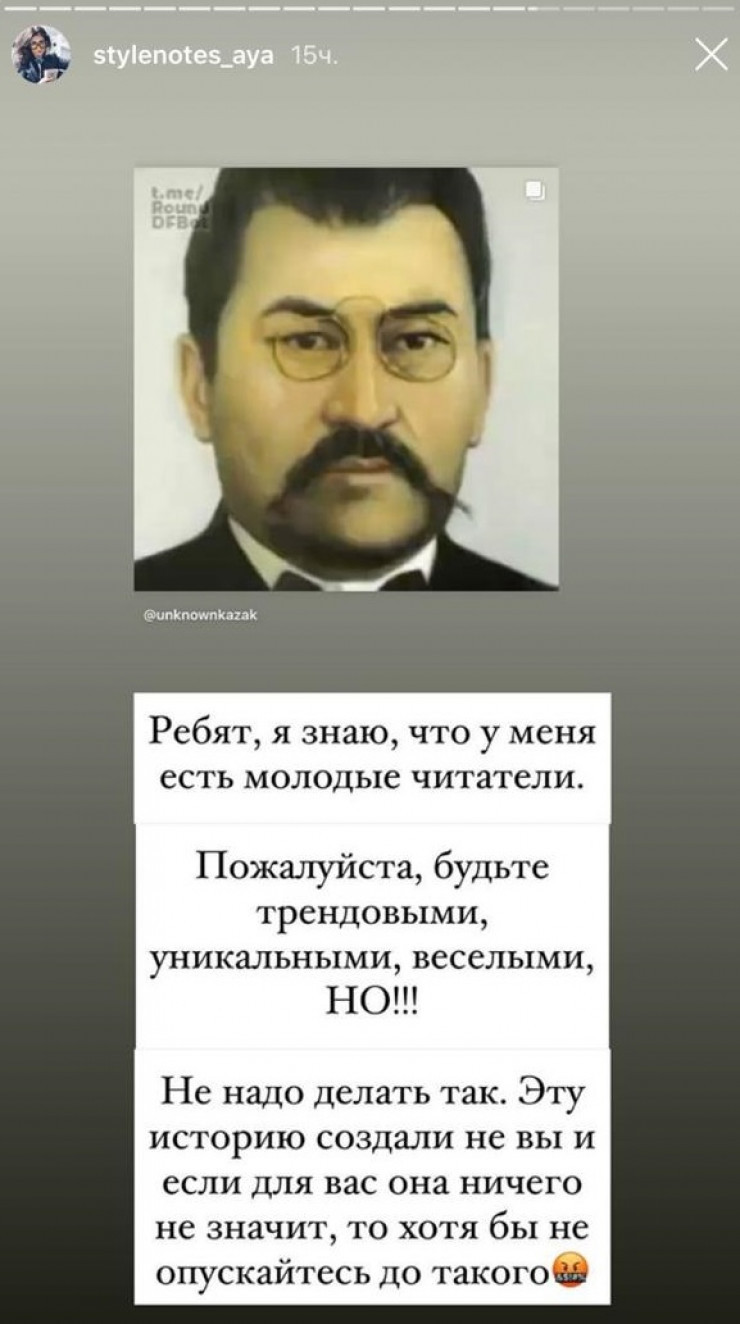 "Я, конечно, не против современных трендов, но ведь должны же у нас быть какие-нибудь сакральные вещи, которые нельзя трогать. Кстати, эта последняя фотография нашего лидера Алихана Бокейхана была сделана в Бутырской тюрьме, незадолго до расстрела. К сожалению, выросло целое поколение, для которых чужды и незнакомы идеи "Алаш". И это не только про молодежь. А вы как считаете? Допустимы ли такие приколы?" - обратился автор.