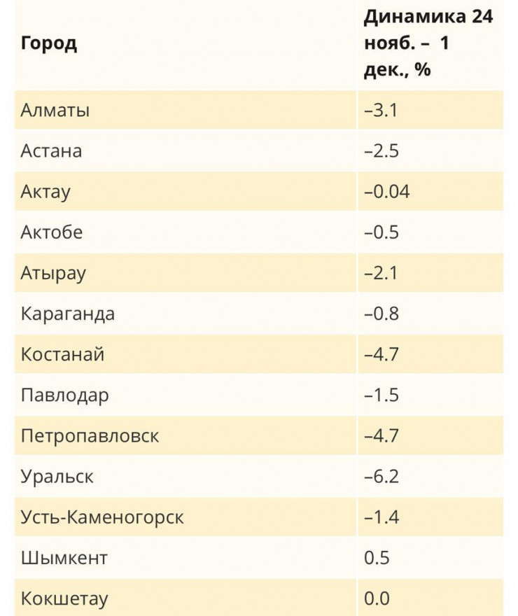 По состоянию на 1 декабря цены на аренду еще не вернулись на доажиотажный уровень (начало сентября). Наибольший разрыв остается в Костанае (+24,6 процента), Павлодаре (+16,9 процента), Алматы (+16,1 процента), Астане (+11,7 процента).