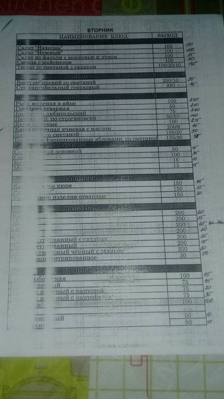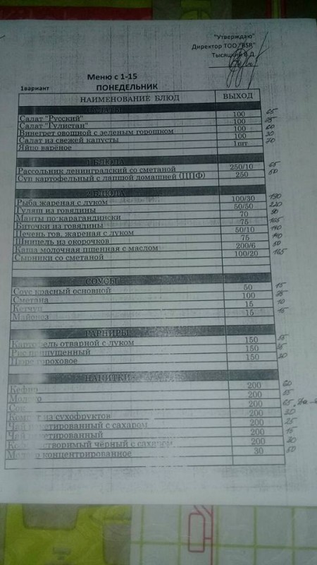 На снимках представлено меню с понедельника по пятницу. Так, стоимость первых блюд начинается от 50 тенге за порцию и не превышает 135 тенге (самое дорогое), а вторых (без гарнира) не превышает 265 тенге (самое дорогое). Цена салатов - от 30 до 190 тенге.