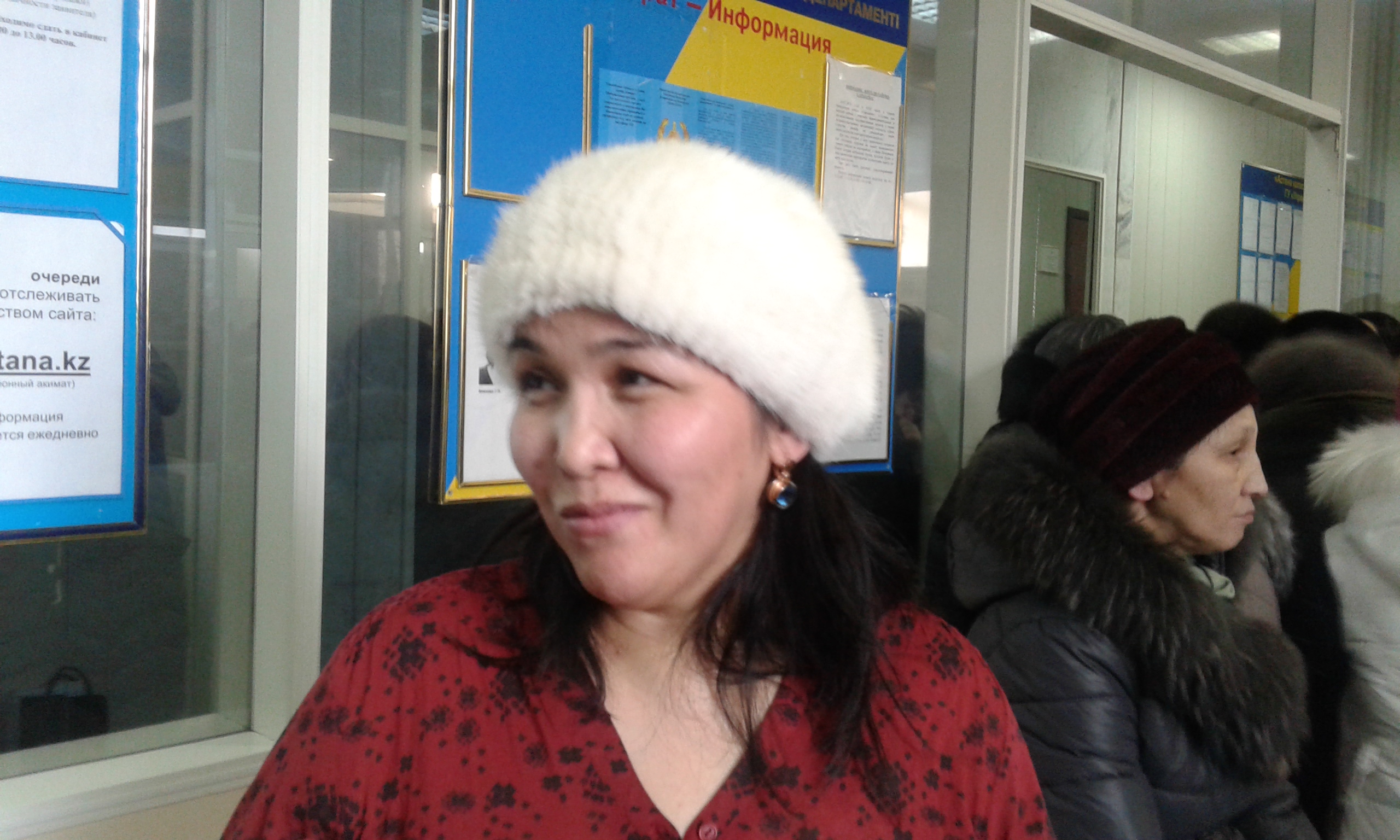 В начале этого видео можно заметить женщину - это Гульзира Ансатова. Она говорит, что сегодня ей здесь стало плохо с сердцем, чуть не упала в обморок. Жительница Астаны рассказывает, что пришла записаться на прием к чиновникам, чтобы, наконец, понять - стоит ей ждать жилья или нет.