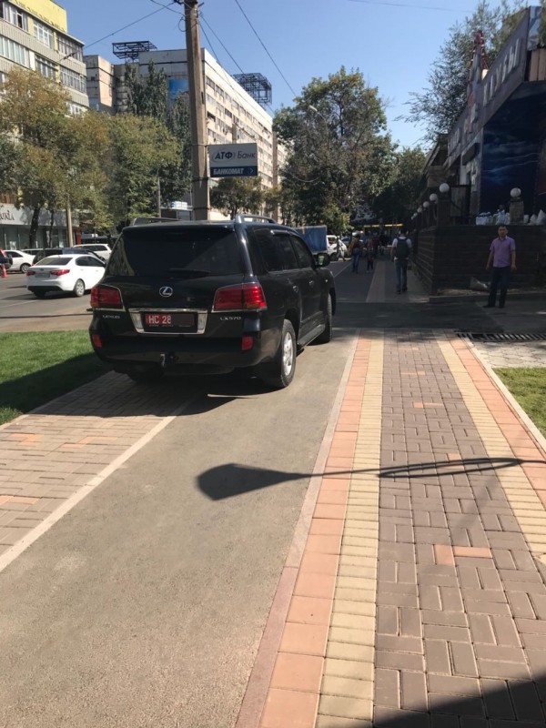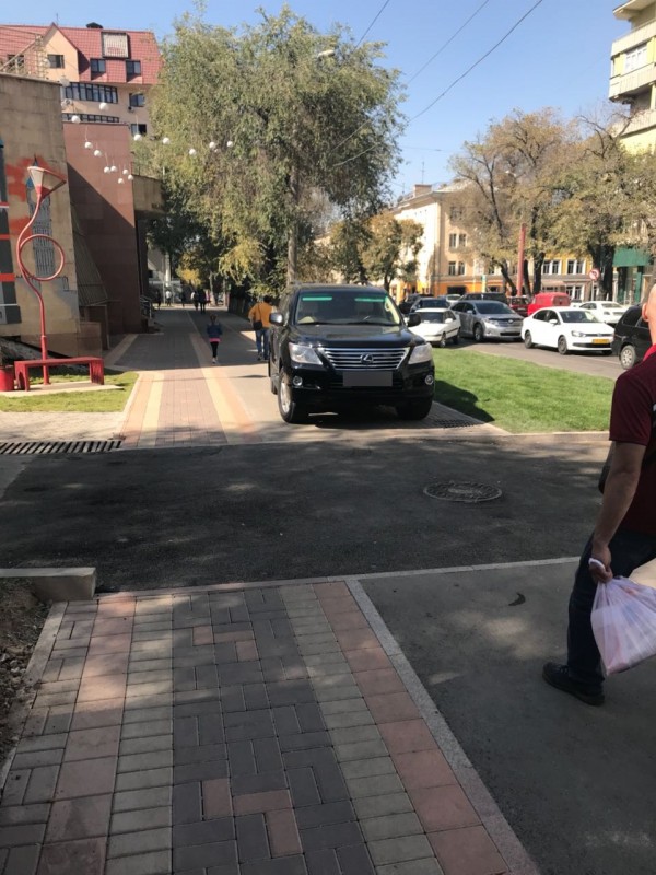 Автомобиль с красными номерами припарковался на тротуаре в Алматы