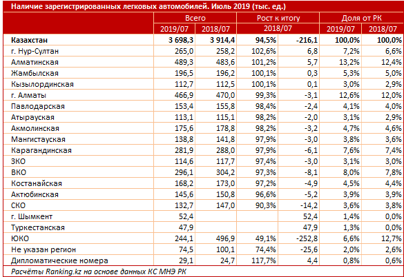 По данным экспертов, в конце июля 2019 года в Казахстане было зарегистрировано почти 3,7 миллиона автомобилей. Это чуть больше, чем в июне, но на 5,5 процента меньше, чем в июле 2018-го. Населению при этом принадлежат 3,45 миллиона легковых авто - это 93,9 процента от общего количества.
