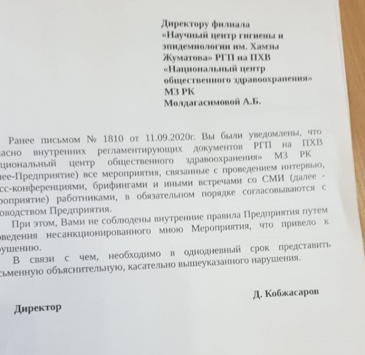 После этого началось истребование с меня объяснительных за период, когда я не работала в центре, письмо о моем невыполнении работы по COVID-19, в которых центр по решению Национального центра общественного здравоохранения в действительности не был задействован, хотя только с моим приходом были разблокированы счета в банке, получены разрешительные документы (лицензии) для запуска работы лаборатории и многое другое.