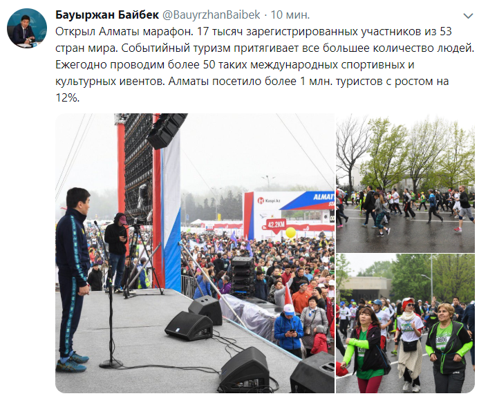 "Открыл Алматы марафон. 17 тысяч зарегистрированных участников из 53 стран мира. Событийный туризм притягивает все большее количество людей. Ежегодно проводим более 50 таких международных спортивных и культурных ивентов. Алматы посетило более 1 млн. туристов с ростом на 12 процентов", - написал Бауыржан Байбек в своем аккаунте.