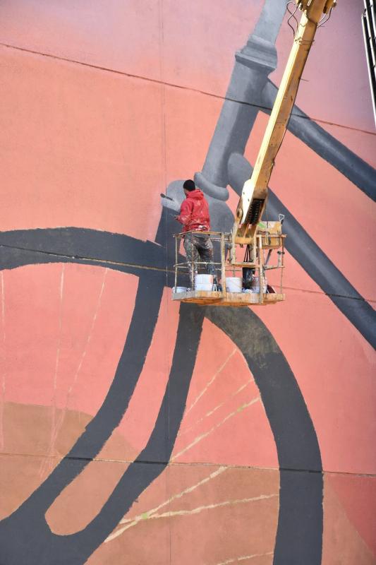 Как и многие его муралы, работа в Алматы посвящена мотивам людей и природе. Каждая его работа рассказывает свою определенную историю. На расписанном фасаде южной столицы Казахстана изображен молодой мужчина в национальном костюме на велосипеде на фоне гор.