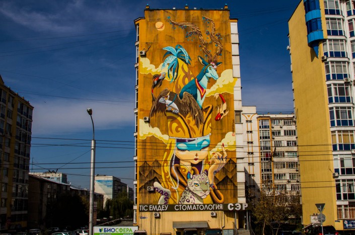 На алматинском мурале Kenji Chai изображена девушка в казахском национальном костюме на фоне гор и облаков, с животными и птицей. Данная задумка художника говорит о том, что все мы должны думать и помнить о природе, заботиться о животных и беречь их.