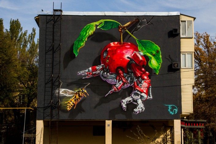 В этом году художники Neon и Shaman решили написать на стене символ города - алматинский апорт. Ребята изобразили яблоко в необычном для нас виде. Оно появилось в модернизированном стиле, который несет в себе идею о будущем.