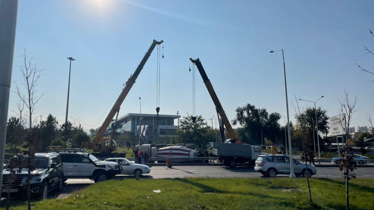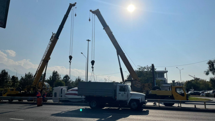Спустя около часа после аварии к месту происшествия подъехали два крана. Они принялись ставить на колеса бетономешалку. Корреспондент Tengrinews.kz оказался на месте инцидента и заснял этот процесс.