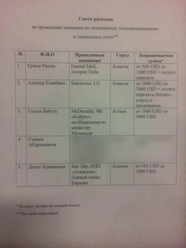 Первым в смете обозначен Ержан Рашев. Указывается, что Рашев якобы запросит за пост от 500 до 1 000 долларов с оплатой перелета. В списке проведенных блогером кампаний указываются Esentai mall и лотерея Tesla. В беседе с корреспондентом Tengrinews.kz Ержан Рашев заявил, что смета - "это полный абсурд и не соответствует действительности".