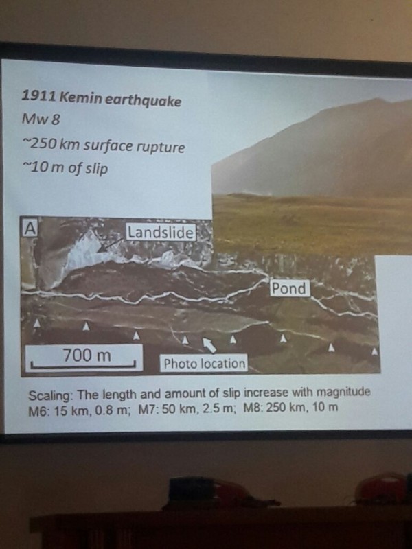 Он продемонстрировал собравшимся так называемый "Лепсинский разлом" недалеко от поселка Лепсы и гор Джунгарского Алатау. Сдвиг тектонических плит, по данным ученых, в этом случае составляет около десяти метров. "Когда произошло землетрясение, изменился канал реки Лепсы. Исследовав отложения в старом русле, нам удалось выяснить, что землетрясение произошло около 400 лет назад. Удивительно, но мы не видим никаких исторических записей о событии. Потенциально речь может идти о землетрясении 1716 года. В оригинальной исторической записи описаны разрушения в районе озер Балхаш и Зайсан, а также в городе Аксу в Китае. Но я не думаю, что это что-то, что мы можем сказать с абсолютной уверенностью", - пояснил ученый.