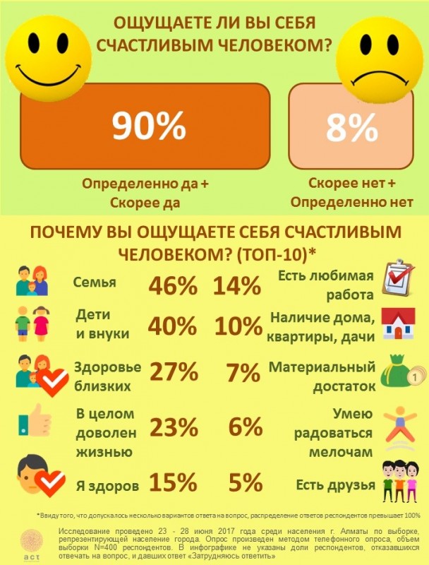 По мнению опрошенных, ощущение счастья им дарит в первую очередь семья (46 процентов). Еще источниками радости являются дети и внуки (40 процентов) и здоровье близких (27 процентов). Счастливыми себя ощущают алматинцы, которые в целом довольны своей жизнью (23 процента), те, кто здоров (15 процентов), и те, кто любит свою работу (14 процентов).