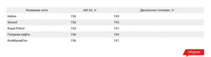 С бензином ситуация стабильная. За литр АИ-92 по-прежнему просят 155-156 тенге. Ценники сменились только у "КазМунайГаза": АИ-92 подорожал со 154 до 156 тенге.